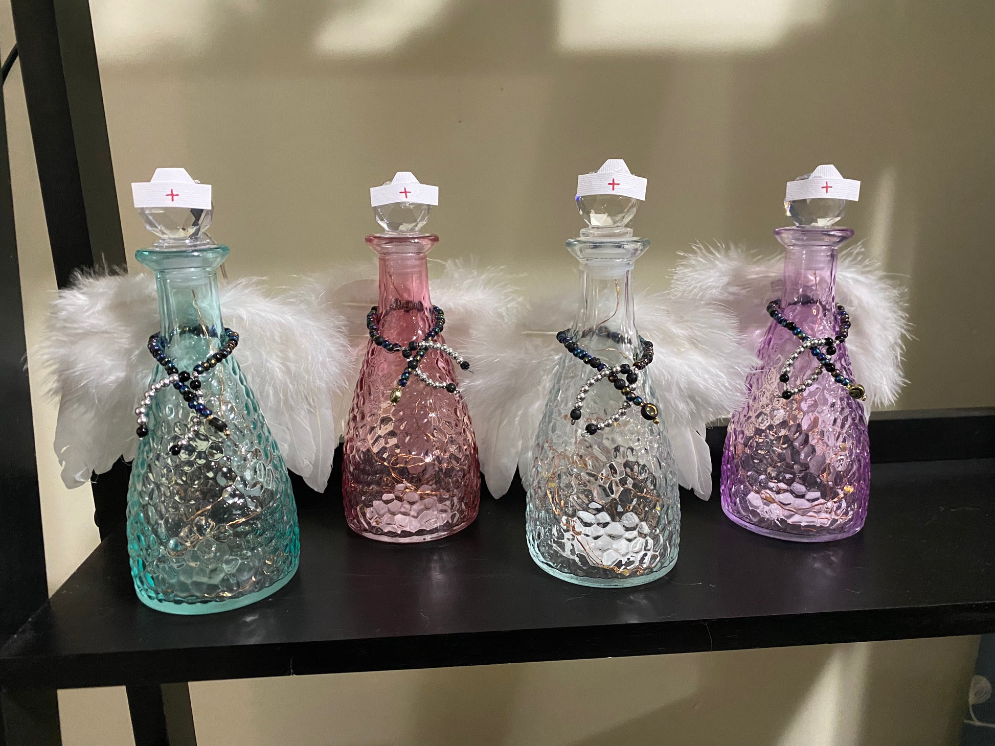 These adorable Angel Nurses are created from bottles, lighted by fairy lights, adorned with feathered angel wings, and sport a mini beaded stethoscope and nurses cap. Each one is 7” tall and are the perfectly unique gifts for the nurses in your life